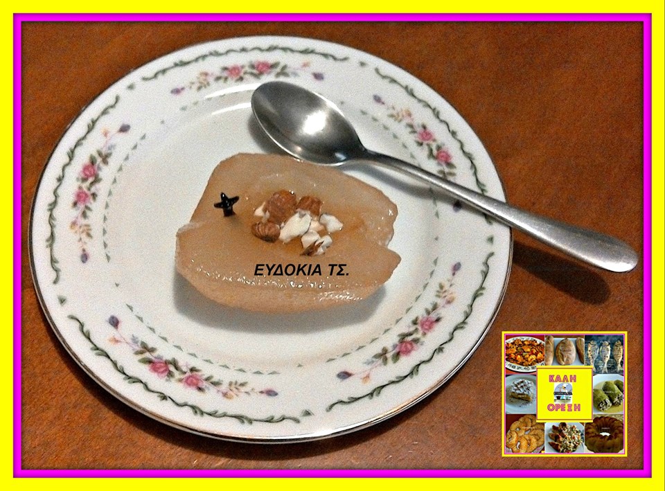 Την επόμενη μέρα βγάζουμε το πιάτο και ξαναβράζουμε το γλυκό μας για 15-20 λεπτά μέχρι να δέσει το σιρόπι του.Προσθέτουμε τα καρύδια